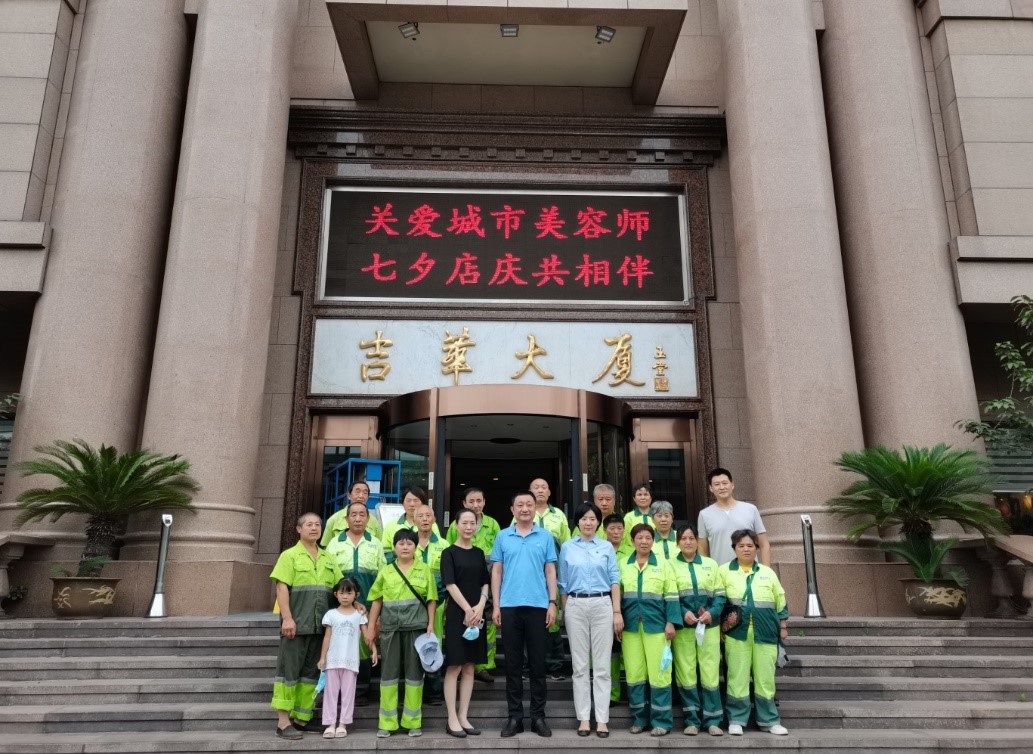 吉华大厦积极投身公益事业,以创新形式承担社会责任。其中围绕关爱环卫工人项目,已持续多年。为表达对环卫工人的关爱和敬意,感谢他们为创建全国文明城市做出的贡献,吉华大厦在炎炎夏日为辖区环卫工人送去清凉慰问;七夕节期间,吉华大厦联合街道社区开展 “关爱城市美容师•七夕店庆共相伴”活动,为环卫工人提供免费早餐。通过公益活动,吉华人践行着诚信尽责的价值理念,彰显国企担当。